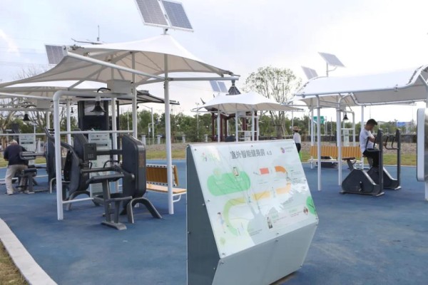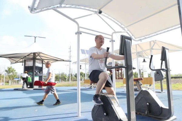 在梅陇镇文体中心北侧公园绿地,一大早,几位阿姨爷叔正围着研究这里的智能化健身设备,实时显示、储存、分析用户体测数据,让体育健身变得更智能、更酷炫、更有趣。