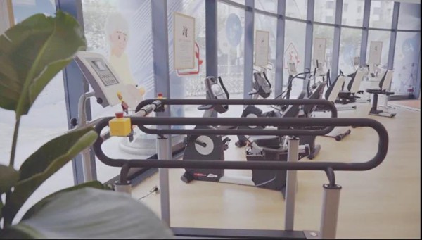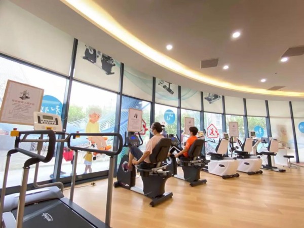 室内健身房包含健身健康宣教、代谢循环促进、安全等速肌力、心肺功能协调能力提升、综合干预功能、健康检测功能、户外智能健身7个功能区,共配备专业老年人跑步机、全身有氧健身车、全身协调训练机、全身垂直律动床、垂直律动沙发等专为老年人设置的适老化康复运动器材45台。