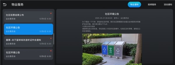智慧屏更重新定义了社区服务体验,报修、缴费、物业通知、社区监控查看、联系物业等功能均能一键触达。比如告诉Max“我家的空调坏了”,系统即刻生成工单直达物业,比物业电话更加快捷。