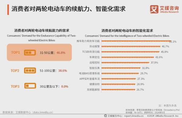 iiMedia Research(艾媒咨询)数据显示,在续航能力方面,46.8%的消费者认为两轮电动车的续航应介于31-50公里;在智能功能方面,55.1%的消费者认为智能两轮电动车应该具备推车助力和倒车功能,异动报警(46.7%)、TCS防侧滑功能(45.9%)以及车辆定位(41.6%)等安全相关的智能功能也备受消费者关注。两轮电动车制造商应继续提升产品的续航能力,并加大在智能化和安全性能方面的研发投入。