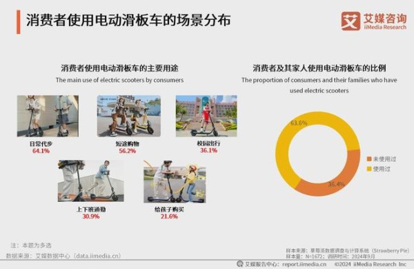 iiMedia Research(艾媒咨询)数据显示,63.6%的消费者及其家人使用过电动滑板车,使用场景方面,日常代步(64.1%)和短途购物(56.2%)是电动滑板车的重要应用场景,36.1%的消费者将电动滑车运用于校园出行,30.9%的消费者骑电动滑板车上下班通勤。电动滑板车不仅满足了人们的日常出行需求,还成为一种时尚的生活方式选择,随着技术的不断进步和市场的日益成熟,电动滑板车的普及率有望进一步提升。