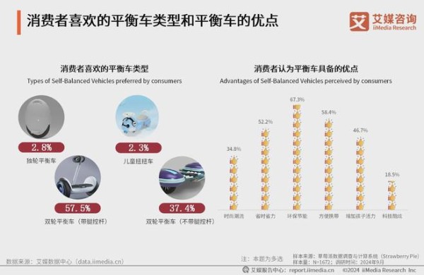 iiMedia Research(艾媒咨询)数据显示,消费者最喜欢的平衡车类型是双轮平衡车,其中57.5%的消费者偏爱带腿控杆型,37.4%的消费者偏爱不带腿控杆型。环保节能(67.3%)和方便携带(58.4%)是消费者普遍认可的平衡车具有的优点,此外,平衡车增加孩子活力(46.7%)、时尚潮流(34.8%)和科技酷炫(18.5%)的特质也吸引不少年轻用户。
