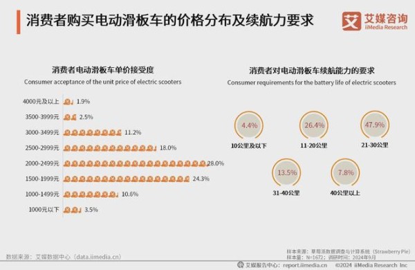 iiMedia Research(艾媒咨询)数据显示,66.4%的消费者会选择2500元以下的电动滑板车,消费者倾向于选择价格在2000-2499元(28.0%)的电动滑板车,对电动滑板车的性价比有着较高的追求。在续航能力方面,47.9%的消费者期望电动滑板车的续航能力区间在21-30公里,21-30公里的续航能力,既能满足大多数城市内短途往返的需求,又能在一定程度上减少频繁充电的麻烦,从而提升消费者的效率。