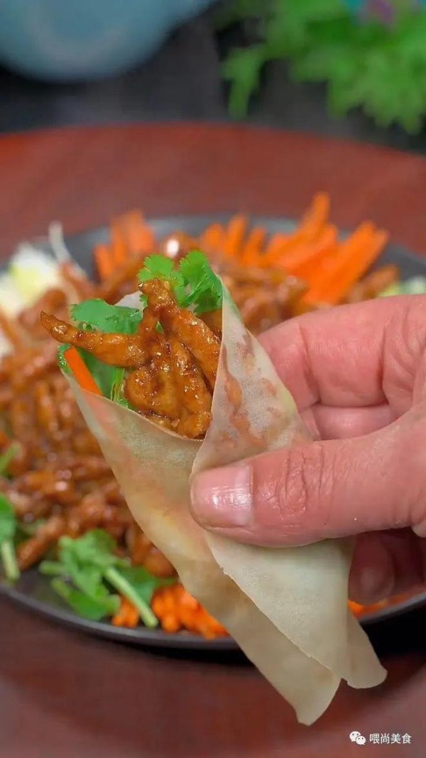 碗中加入一勺面粉,半勺的熟油,搅拌均匀,菜板上抹油防粘,放上一张饺子皮,然后抹上一层油酥,油酥不用抹太多,抹匀即可,依次叠加涂抹上油酥,一次最多五张饺子皮,最顶上的饺子皮就不用再抹油酥了,饺子皮从中间往两边用手按压,这样擀饼的时候就不会往两边跑了。然后再用擀面杖擀成均匀的面饼,放入蒸屉上汽蒸八分钟,提前切好的里脊肉丝加入盐、料酒、蛋清、一勺玉米淀粉,抓拌均匀。锅留底油,下入腌制好的肉丝,用筷子迅速的划散滑熟,放入一勺甜面酱,随便翻炒几下,再撒上一些白芝麻,出锅装盘。蒸好的饺子皮晾凉,然后给它揭开,每一张都又薄又劲道,再卷点配菜,放上肉丝,这个味道比烤鸭都香。