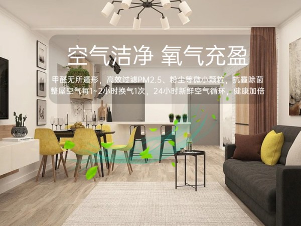 全空气系统内置带有全热交换功能的新风系统24小时不间断向室内送入洁净、富氧空气,全年持续排出甲醛、TVOC等家具、建材所挥发的污染物,确保CO₂≤900PPM,TVOC≤0.5mg/m³,甲醛≤0.1mg/m³,室内空气干净新鲜,令人精神充沛。
