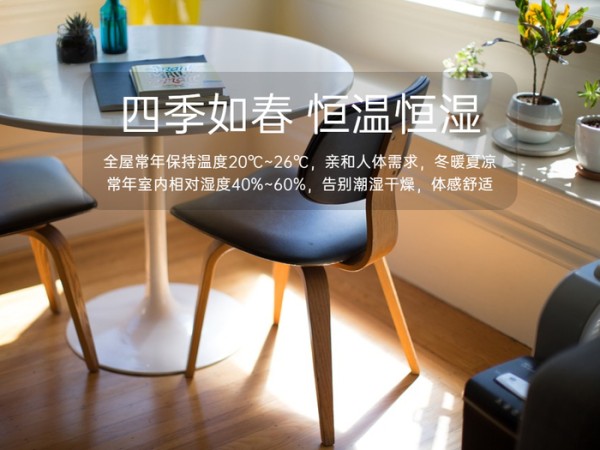 新鲜干净的空气经过全空气系统预冷(预热)和加湿(除湿),将温度/湿度适宜的空气输送到各个房间内部,室内温度分布均匀,无温差、无风感,实现四季恒温恒湿,全屋常年温度保持在20℃~26℃,湿度保持在40%~60%,亲和人体需求,冬暖夏凉,不干