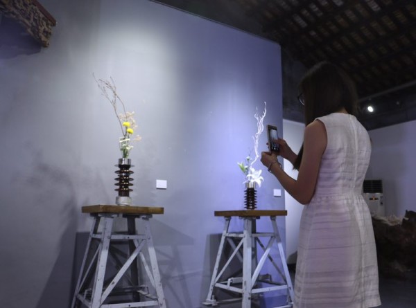 肩负传输电力重任的铁塔被拆解,代表工业文明的铁塔底座上摆放着陶瓷绝缘子,插上一朵禅花,美得惊艳的同时,强烈的反差也让人深思:柔软的文化也能从工业的电力上“生长”。