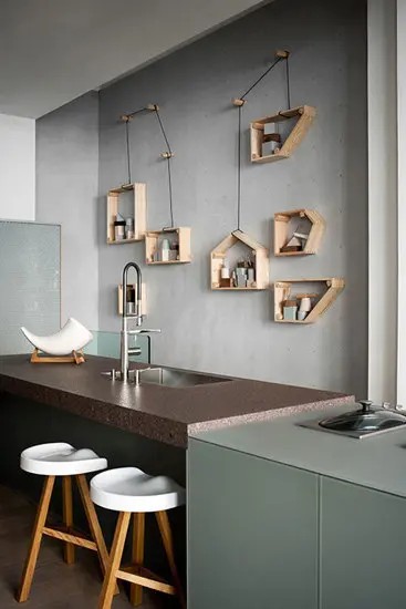 编辑点评:创意的框架挂饰不但能美化单调的背景墙,而且能用于调味品瓶子的存放,增加收纳空间。凳子的凳面设计十分人性化。
