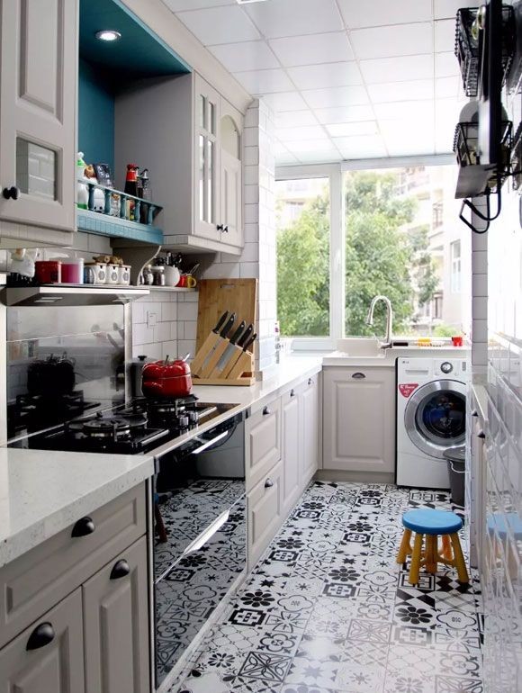 厨房的地面大多选择瓷砖来装饰,尽量选择有防滑效果的瓷砖,具体的颜色、图案可以参考家中的装修风格。
