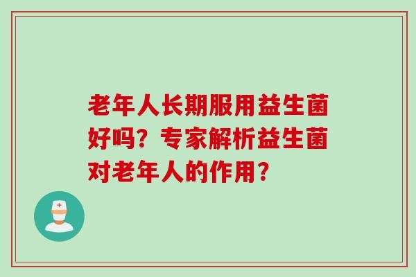 随着人们健康意识的提高,益生菌在日常饮食中的应用越来越广泛。而对于老年人来说,益生菌的作用更是备受关注。那么,老年人长期服用益生菌到底好不好呢?下面,让我们一起来听听专家的解析。 一、益生菌对老年人的作用 1.促进肠道健康 老年人的肠道功能逐渐减弱,易受到各种的侵袭。而益生菌可以调节肠道菌群平衡,增强肠道力,减少有害菌的繁殖,从而促进肠道健康。 2.改善营养吸收 随着年龄的增长,老年人的消化吸收能力逐渐下降。而益生菌可以增加肠道内有益菌的数量,促进食物中营养物质的吸收,从而改善老年人的营养状况。 3.缓解 老年人常常因为生活习惯改变、运动量减少等原因而出现的症状。而益生菌可以增加…
