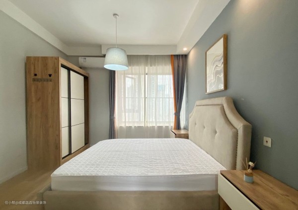 主卧的布置温馨舒适,一张软包的双人床搭配着顶部的一盏吊灯,大面积的窗户为室内带来充足的采光,蓝灰色的墙面漆搭配着原木的家具,舒适且温暖。