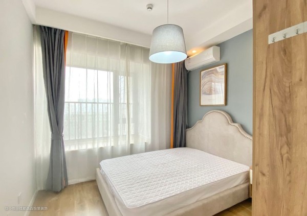 次卧的空间布置与主卧一致,保障整体的统一性,定制的柜子增加空间的收纳面积。