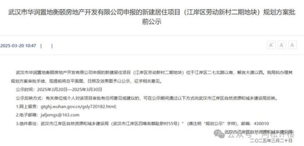 3月20日,武汉市华润置地衡颐房地产开发有限公司申报的新建居住项目(江岸区劳动新村二期地块)规划方案批前公示。
