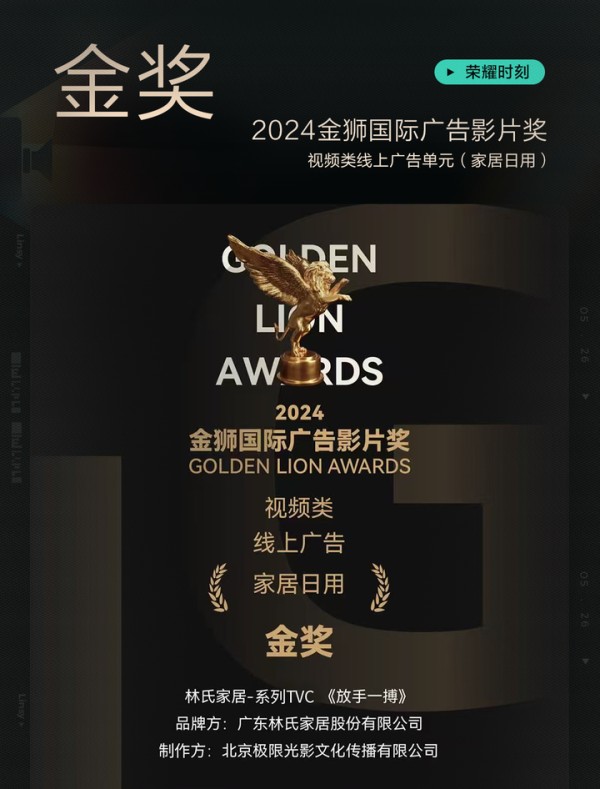 值得一提的是,此前该影片也荣获2024金狮国际广告影片视频类线上广告家居日用类目金奖、以及视频类线上广告营销银奖,进一步印证了林氏家居用创意触达用户的实战能力。