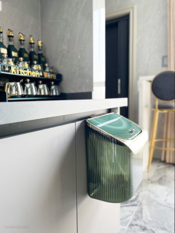 日常生活中做饭经常会产生厨余垃圾,在橱柜上挂置一个小垃圾筒,扔垃圾更加精准,挂式垃圾桶同时考虑到人力的消耗,不用经常蹲下弯腰在垃圾桶旁刨菜。厨房地面上不摆放垃圾桶,能够预防人们在厨房活动时不小心踢倒垃圾桶,增加清理步骤。