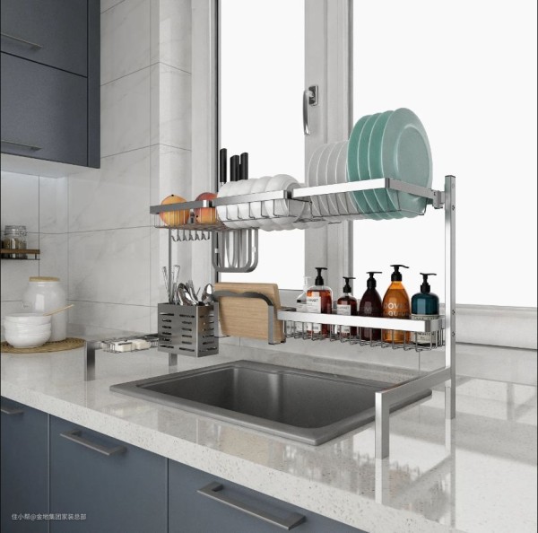 平日里我们在洗碗池洗完碗后如果未用抹布进行擦拭的话,就有许多水分残留在碗具上。这时我们只是将它搁置在台面上,不一会就容易堆积成一滩水渍。在水槽上安装一个沥水置物架能够轻松的解决这个问题,洗碗的工具与置碗置筷区分开,有效地完成洗碗——摆放——沥干三个步骤,垂直镂空的设计能够让残留的水珠滴落在水槽中,不会搞湿台面,给厨房一个干透的环境。