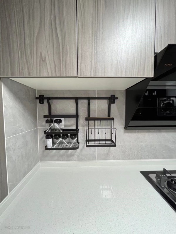 厨房里的一些小物件,比如烹饪食材需要的调料用品,刀具和铲子都都需要归类收纳起来,以往这类厨房用具都是摆放在台面或橱柜里,翻找起来较麻烦。因此选择免打孔式置物挂钩杆,免打孔的好处不但能够不破坏墙面的瓷砖,留以完整的美观度,同时还能利用墙面,节省厨房台面空间,方便屋主在厨房烹饪时拿取用具,非常顺手。