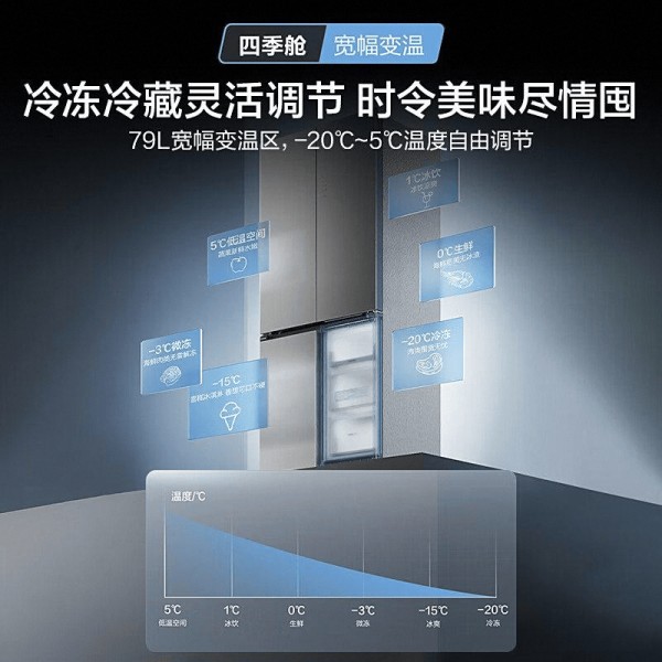 四季舱是这款冰箱的一大亮点,它拥有从-20℃到5℃的宽域调温能力,相当于一个独立的小型多功能储藏室。无论是需要短时保鲜的药材、茶叶,还是准备宴客时的高端食材如鹅肝、刺身,都可以找到合适的存放环境。这个空间的存在,让冷藏与冷冻之间的过渡更加平滑自然,减少温度跳跃带来的品质损耗。