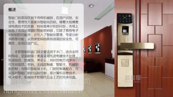 智能门锁是指区别于传统机械锁,在用户识别、安全性、管理性方面更加智能化的锁。随着大规模集成电路技术的发展,特别是单片机的问世,市场上出现了带微处理器的智能密码锁,它除了具有电子密码锁的功能外,还引入了智能化管理、专家分析系统等功能,从而使密码锁具有很高的安全性、可靠性,应用日益广泛。