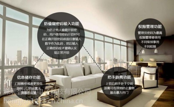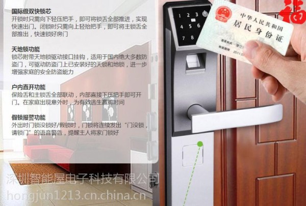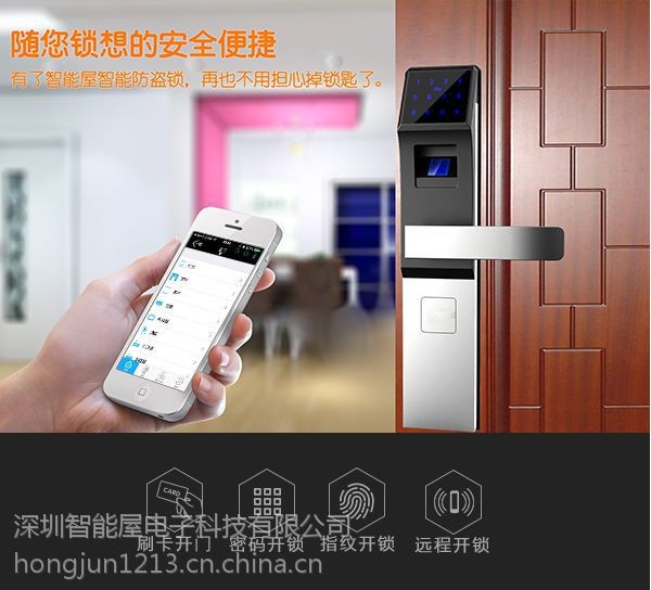 智能门锁主要适用于木门,由合金材料构成,坚固耐用;表面采用***电镀技术处理,色泽悦目、防腐蚀、寿命长;同时控制方式多元,可支持指纹、无线控制盒、机械钥匙控制;与我司智能屋主机、门锁控制盒配合,可实现对智能门锁的远程控制,是计算机信息技术、电子技术、机械技术和现代五金工艺的***结晶。