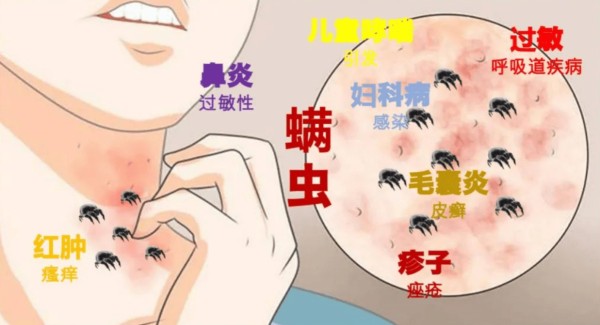 ▲引发皮肤问题螨虫(如尘螨)的分泌物、排泄物及尸体残骸是常见过敏原,若不及时清除,会附着在床单、被褥、沙发等家居织物上。长期接触可能导致皮肤过敏,出现湿疹、荨麻疹、痤疮等问题,尤其对儿童、过敏体质人群影响更明显。例如,尘螨过敏可能引发特异性皮炎,表现为皮肤红肿、瘙痒,反复抓挠还可能继发感染。