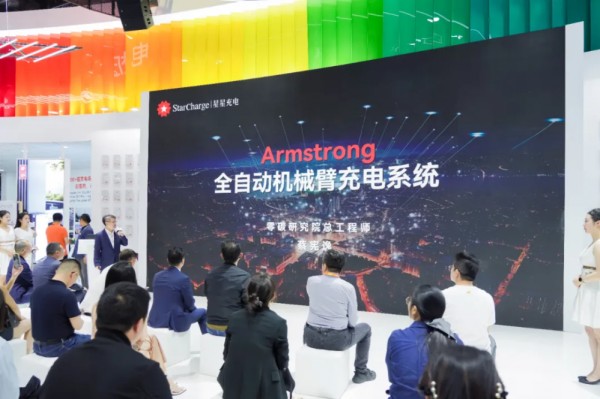 紧接着,星星充电首款具身科技“Armstrong全自动充电机械臂”惊艳登场。该产品由星星充电零碳生活研究院总工程师蔡宪逸揭晓,其搭载AI视觉识别与柔性机械臂技术,可自主完成车辆定位、插拔充电枪等操作,适配复杂场景。“机械臂不仅是工具,更是零碳生活的‘智能管家’。”蔡宪逸表示,“它将彻底解放用户双手,让充电像停车一样简单。”