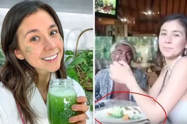 左:社交媒体上,门多萨宣扬纯素食物。右:门多萨被拍到吃鱼