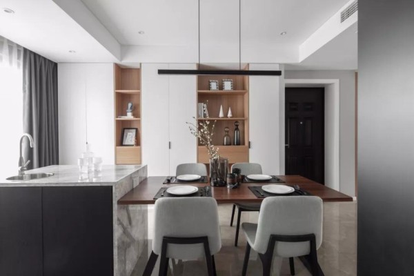大部分餐厅摆放岛台的设计,都是在餐桌椅的边上做上一个岛台,岛台比起餐桌会更高一些,有一些屋主还会在岛台上设计一个洗手池。