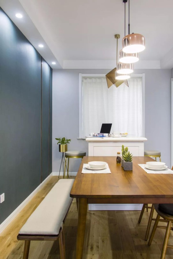 这种组合式的设计看起来会更舒服一些,但也有个麻烦之处,就是餐桌完全被固定住了,就算想要挪动或扩大餐厅的面积,都不太方便。