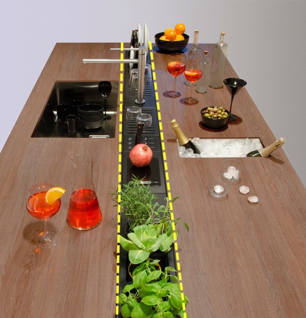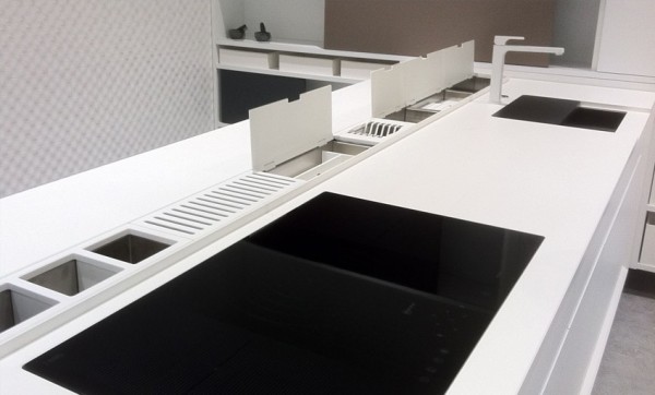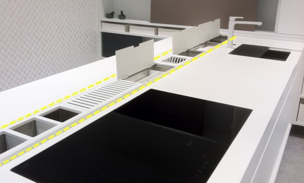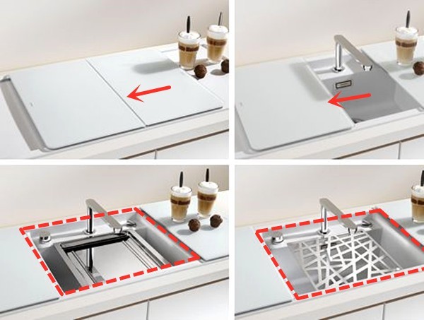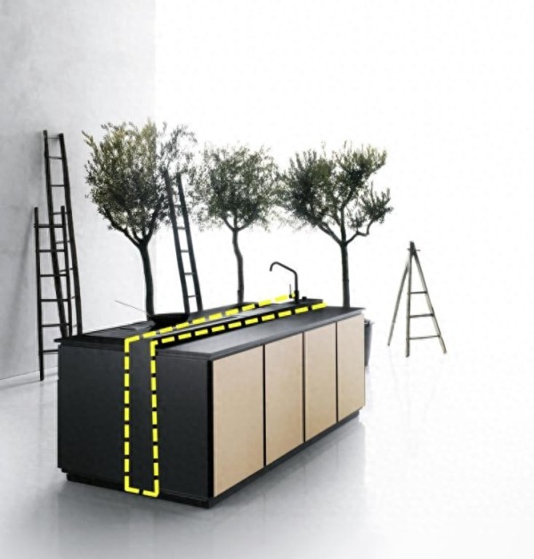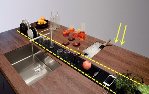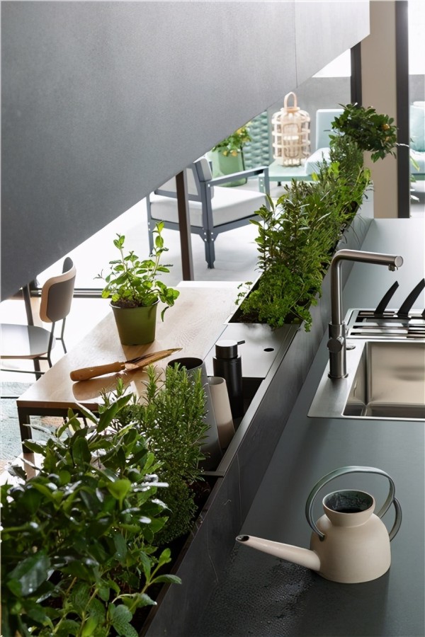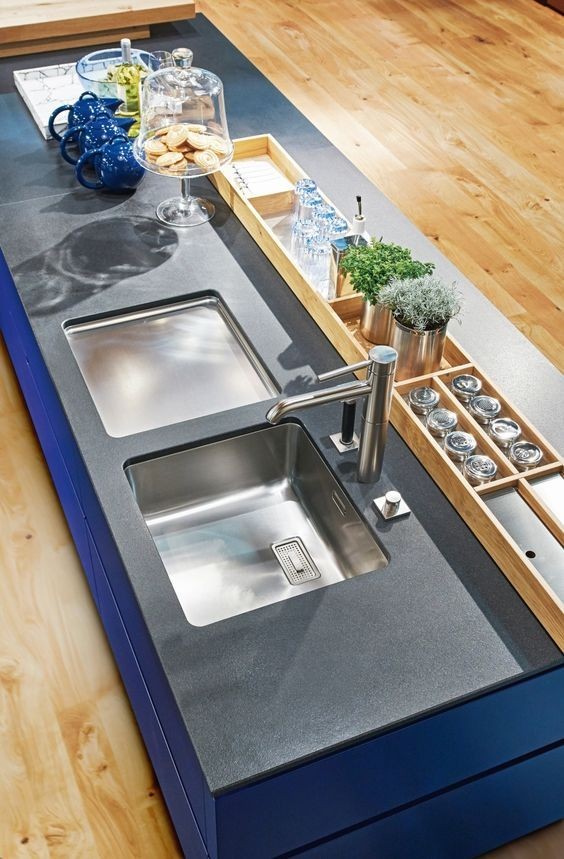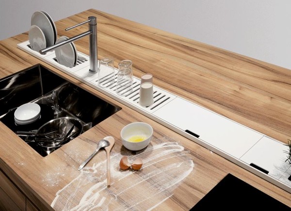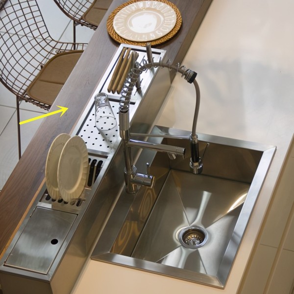 第二个就是水槽区水龙头设计,建议选择可以折叠的水龙头,这样当不需要洗刷的时候,可以加盖板将水槽封起来,作为操作台面使用,超灵活!