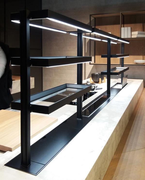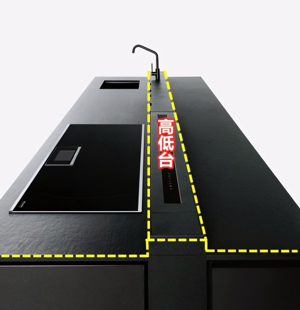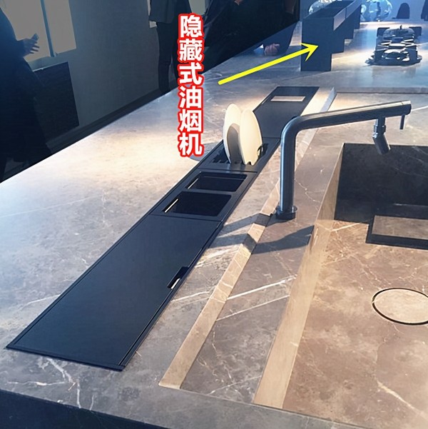 第一个就是灶台上方油烟机该怎么装呢?有2个方式,一个是顶面吊挂油烟,岛式油烟机,与岛台是黄金搭配,另一个是安装可升降的隐藏油烟机,隐藏在岛台台面下方,一点不占面积,吸油烟力一点不差。