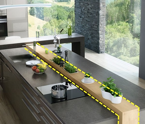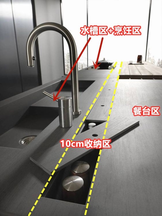 而至关重要的是岛台中间挤出了10cm宽的收纳区,以它为分界线,才实现了岛台台面的“三式分离”。具体这10cm宽的收纳区可以如何设计呢?给大家盘点了5种装法。