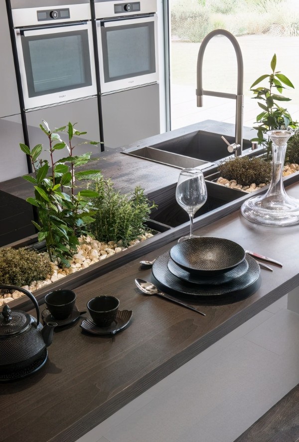 厨房加入岛台设计,本来就是扩大了厨房的操作和收纳空间,但往往岛台偌大的台面用不到三分之一的台面,鸡肋不实用,现在又在岛台台面上做一分为二,将岛台台面“搜刮殆尽”,这样做的好处是能够极致利用每一寸台面,不浪费。