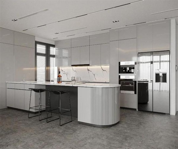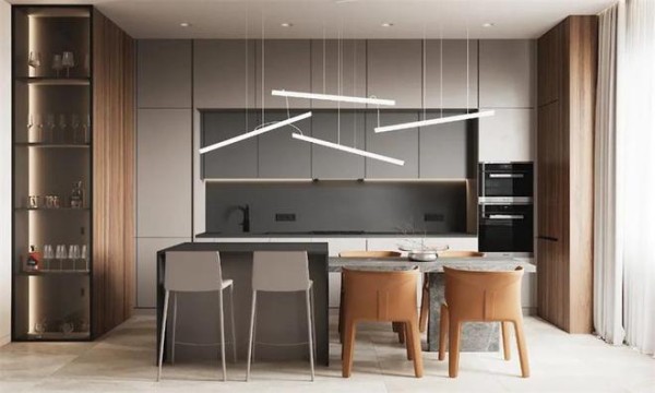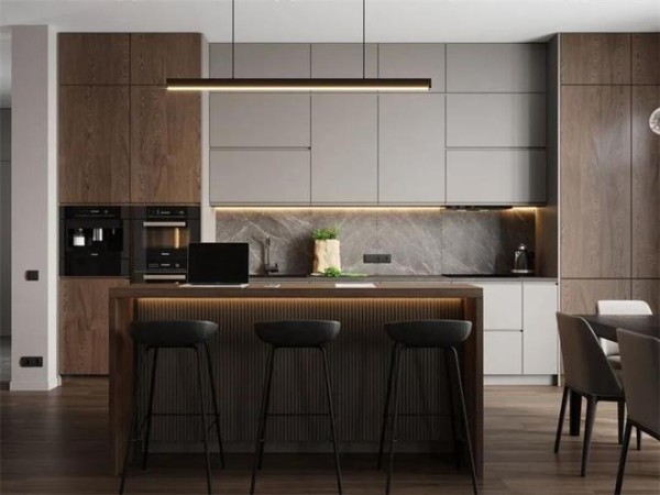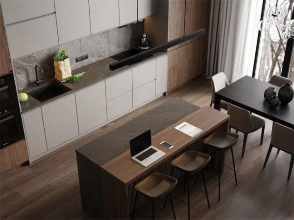 3.用餐:做完饭,直接在岛台简单吃顿饭也没问题。用餐人数较多,将餐桌与岛台融为一体比较合适。通常岛台比餐桌高,方便站立和烹饪。方便设计插座和开关。
