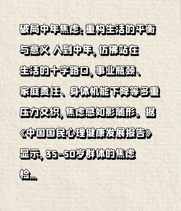 人到中年,仿佛站在生活的十字路口,事业瓶颈、家庭责任、身体机能下降等多重压力交织,焦虑感如影随形。据《中国国民心理健康发展报告》显示,35-50岁群体的焦虑检出率较其他年龄段高出12%,这一数据印证了中年焦虑已成为普遍的社会现象。但焦虑并非无解的困局,通过认知重构、行动调整与心态重塑,中年人完全能够打破焦虑的桎梏,重获生活掌控感。