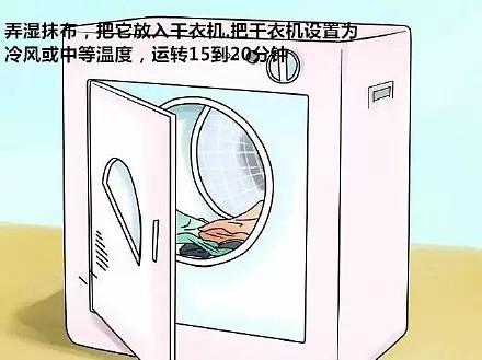 第一招,把抹布弄湿(当然是要干净的啦),然后连同衣服一起放入干衣机,把干衣机的设置调为冷风或者中等温度,运转15到20分钟就可以啦!