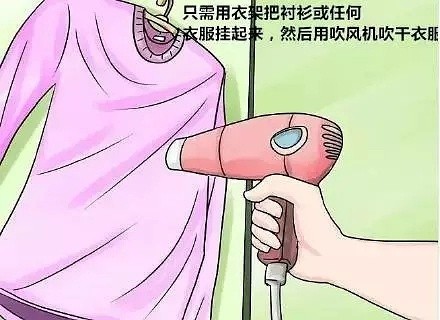 第三招,把衣服挂起来,用吹风机吹干衣服。