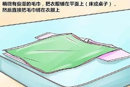 第六招,把衣服平放在桌上,用有些湿的毛巾铺在衣服上。