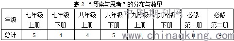 在义务教育课程标准教科书与普通高中教科书中都有“阅读与思考”这一模块(表2),其中有涉及数学史、生活数学等方面的内容,这些都是教材研发中心精心编制的,是可供学生阅读的最直接、最有效的材料。教师也可通过变式阅读材料来进行课堂教学,如将阅读材料中的问题作为情境导入教学或者将材料中的例题进行改变创设新的教学背景,也可以将材料中的内容作为教学素材,以激发学生的学习兴趣等。在阅读训练的过程中,要鼓励学生把文字语言转化为数学语言,并且要学会提取材料中的关键信息,剔除材料中的一些不必要条件,有选择性的进行解题,提高解题能力。