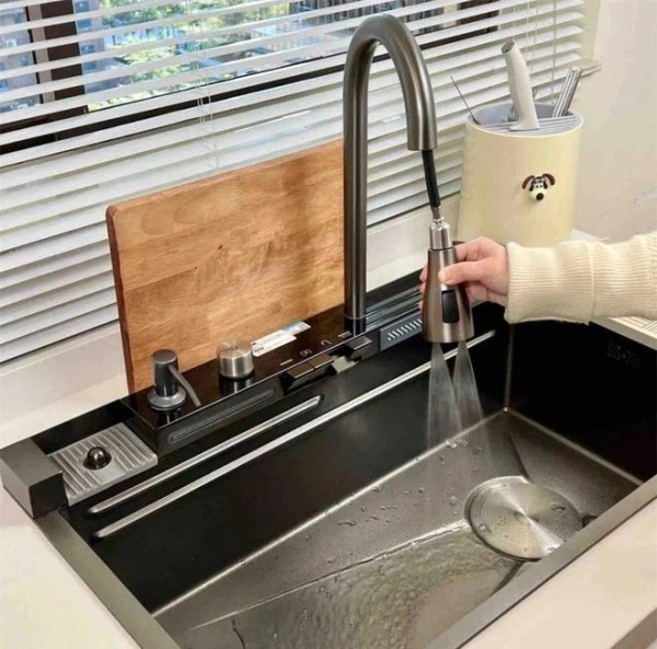 而在此基础上,还进化除了可以洗杯子、放置洗碗布、带水瀑功能的多功能大单槽,真的是满足各种厨房清洗场景,好用极了!