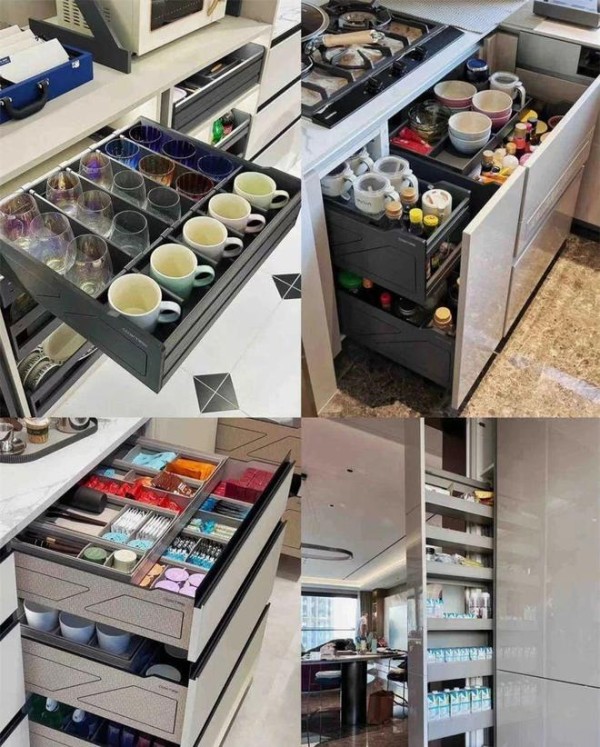 橱柜装修的“花样”可就更多了,除了在底柜加入各种不同的拉篮收纳格,同时还利用缝隙和橱柜转角,做各式各样的收纳格抽屉拉扇,将每一寸空间尽可能充分使用到,避免浪费。