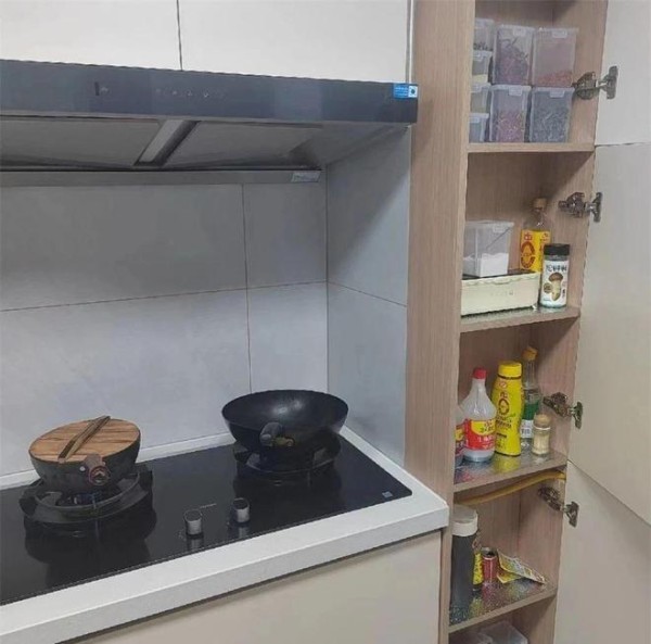 厨房橱柜旁边,往往有一个窄窄的空间被浪费掉,又不知道如何利用,其实,完全可以做一组超窄柜,用来收纳各种瓶瓶罐罐和调味品,柜门一关,各种杂乱隐藏其中,厨房看起来清爽多了。