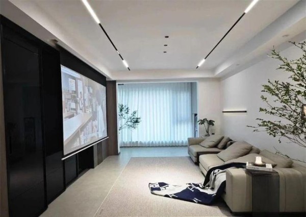 如果想进一步简化,甚至可以用投影幕布代替固定的电视墙,原本空间不大的客厅,一下子就显得宽敞了很多。