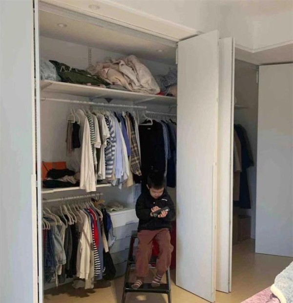 最后,家里原本预留给衣柜的位置,也可以不做定制衣柜,转而用可以活动的层板架进行代替,不仅更为灵活,同时也可以搭配折叠柜门,变成步入式的衣帽间。