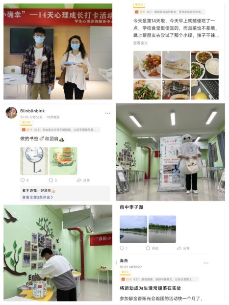 10月伊始,重庆交通大学三百多名师生参与了一项“我的小确幸”14天心理成长打卡活动,记录生活中点滴的美好,并且每天都学习一个心理学小知识。本次活动打卡次数超过2700人次,上百人14天全程打卡。大家通过打卡来分享和记录生活的“小确幸”“小美好”,比如对学校新园区的赞美、学习充实的快乐、寝室的欢乐温馨、运动的酣畅淋漓、做手工的细腻美好、在新食堂吃饭的幸福……