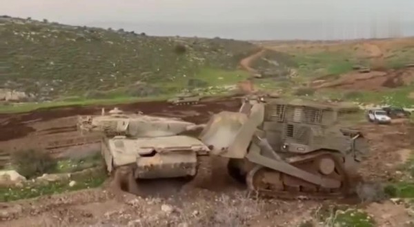 以军D9推土机推动63吨的抛锚梅卡...