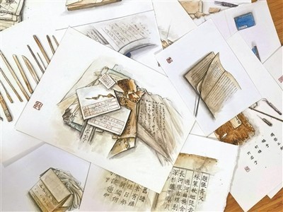 看着那些熟悉的修复工具和场景,王岚突发奇想,用水彩画起了她最熟悉的这些画面。她画了一张又一张,画作灵动唯美,充满生活气息,也体现了她对古籍修复的挚爱。
