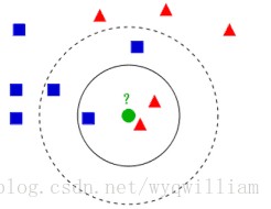 如果K = 3,绿色圆点的最近的3个邻居是2个红色小三角形和1个蓝色小正方形,少数从属于多数,基于统计的方法,判定绿色的这个待分类点属于红色的三角形一类。