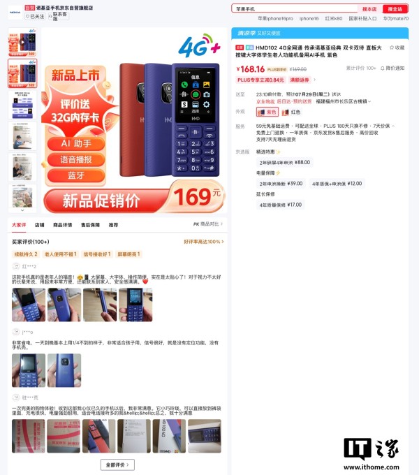 相应话题也在微博平台引起讨论,IT之家参考诺基亚手机京东旗舰店,其中显示目前该机(HMD 102)评价在 100+ 左右,而另一款 7 月 15 日推出的 HMD 101 功能机评价在 500+ 左右。
