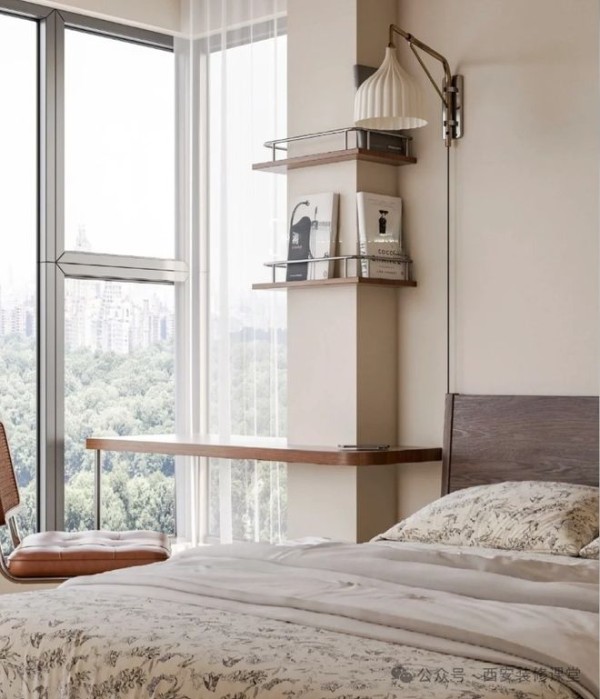 如图卧室的突兀的柱子,利用起来转角定制一张悬浮书桌,同时采用转角杂志架满足书籍的随手放置,不仅弱化了柱子的突兀,同时成就功能,空间反而更有设计感